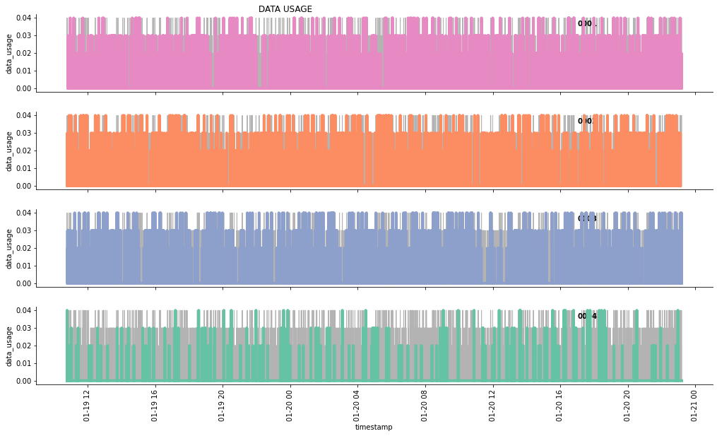 x="timestamp", y="data_usage", col="simid", hue="simid",col_order = ['0001', '0002', '0003', '0004'],