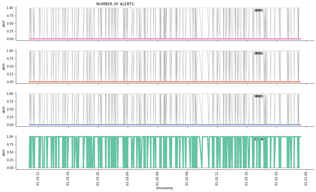 x="timestamp", y="alert", col="simid", hue="simid",col_order = ['0001', '0002', '0003', '0004'],
