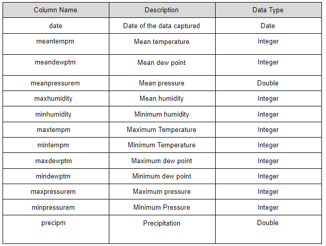The reason why we have sent only the `date`, `meantempm`, `meandewptm`, `meanpressurerm`, `maxhumidity` is because we are going to analyze data only in these particular columns, and it’s not required to store all the columns in the dataset in our database.