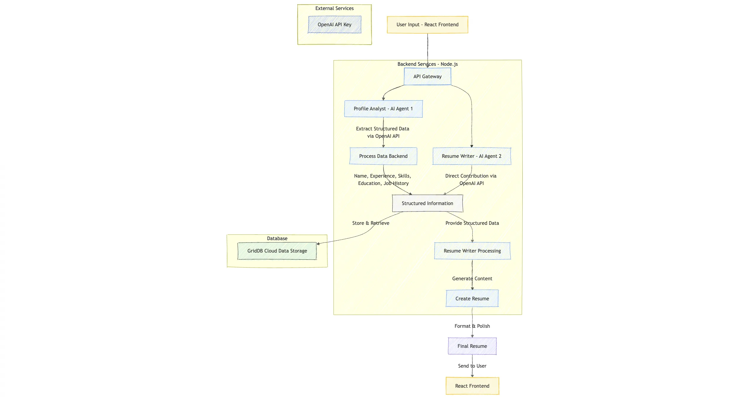 This system diagram illustrates the resume creation process discussed in this blog, showcasing the collaboration between two main AI agents: