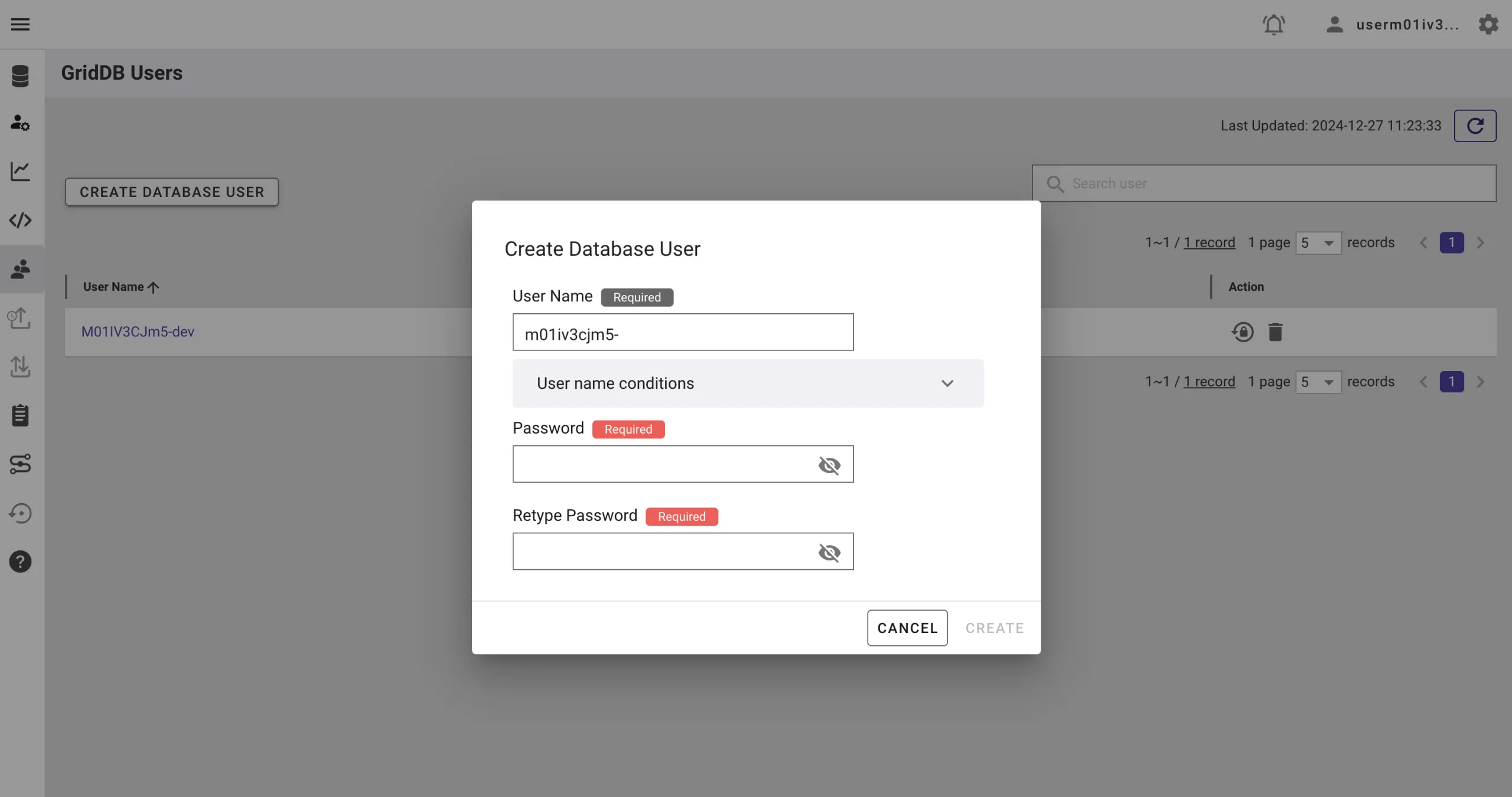 Go to the GridDB Users section of the GridDB Cloud portal and create or copy the username for GRIDDB_USERNAME. The password is set when the user is created for the first time, use this as the GRIDDB_PASSWORD.