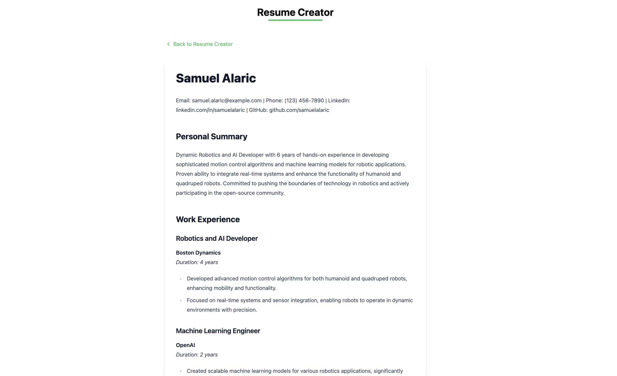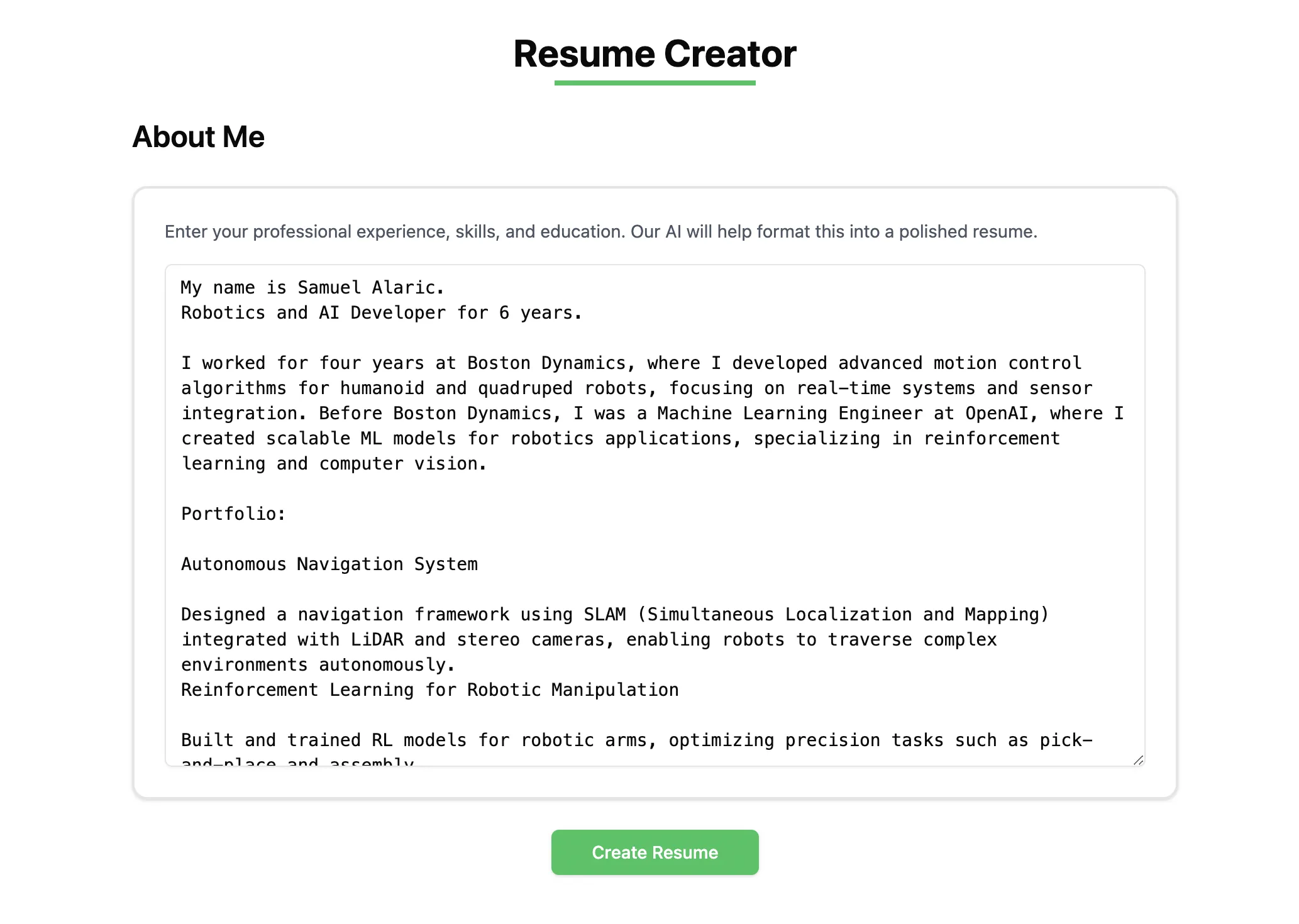 The ResumeCreator component is built using React and allows users to input their details in a text and generate a resume with the click of a button. The user interface is designed to be simple.