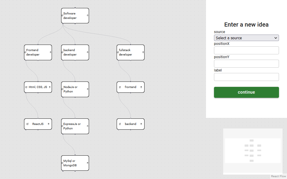 On the top right corner, we have the form that allows you to enter the details of a new idea. There are 4 input fields. Source is a dropdown of the node your idea is to be linked to. For example, the source for “Frontend developer” is “software developer”.