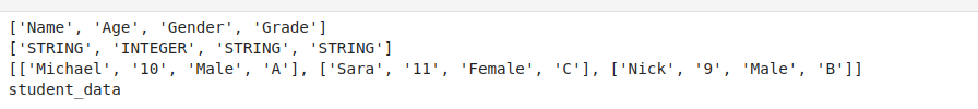 select_query='SELECT * FROM student_data WHERE Age > 10' container_name='student_data'