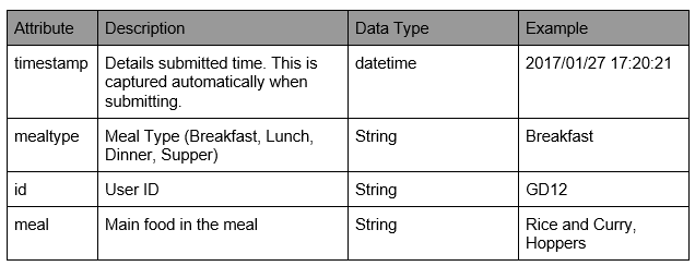 There is a project about human nutritions that requires collecting data related to the breakfast, lunch and dinner of selected people. Every person has an ID for unique identification and they are required to log the details such as ID, type of meal and foods included in the meal to a web based form right before having each meal. Since this application automatically captures the submitted timestamp, the users don’t have to add the time explicitly. Moreover, this application consists of a simple HTML form with a PHP backend and GridDB database .