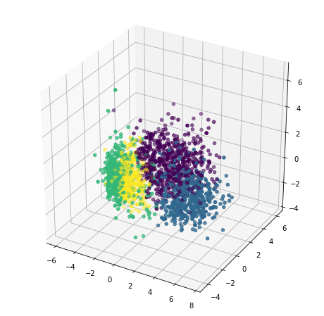 The number of clusters is chosen as 4. However, for real-world models, there are approaches such as the Elbow method to anticipate the ideal number of clusters for a sample of data.