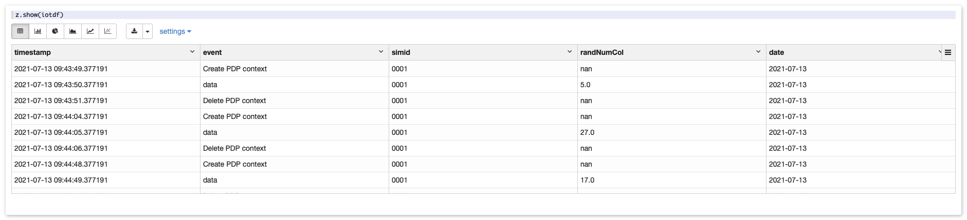 Contrary to Jupyter, you do not need to write Python code to build charts in Zeppelin. As you may have noticed, z.show() created a first visualization where you can switch between a table view and different chart types.