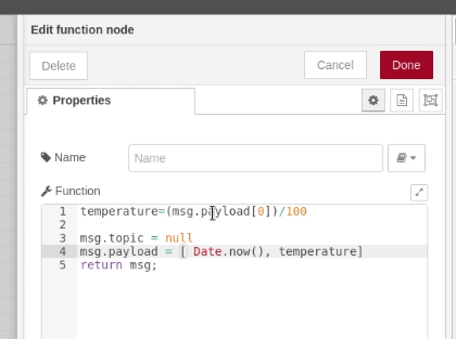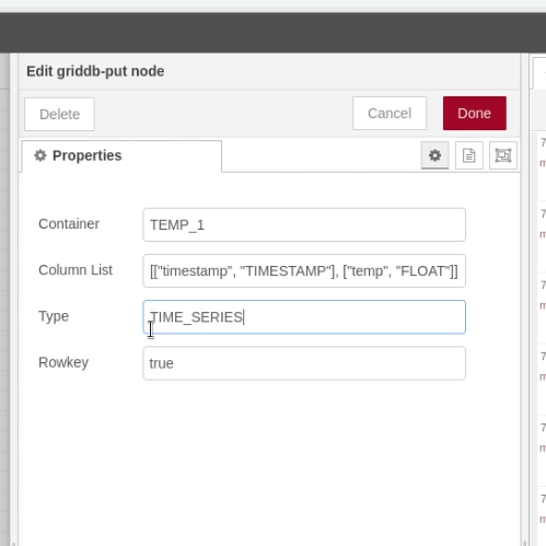 We transform the data so it is suitable for input to the GridDB-Put Node. The temperature is divided by 100 as it’s multiplied by 100 to not loose precision and converted to an integer to fit into the Modbus register.