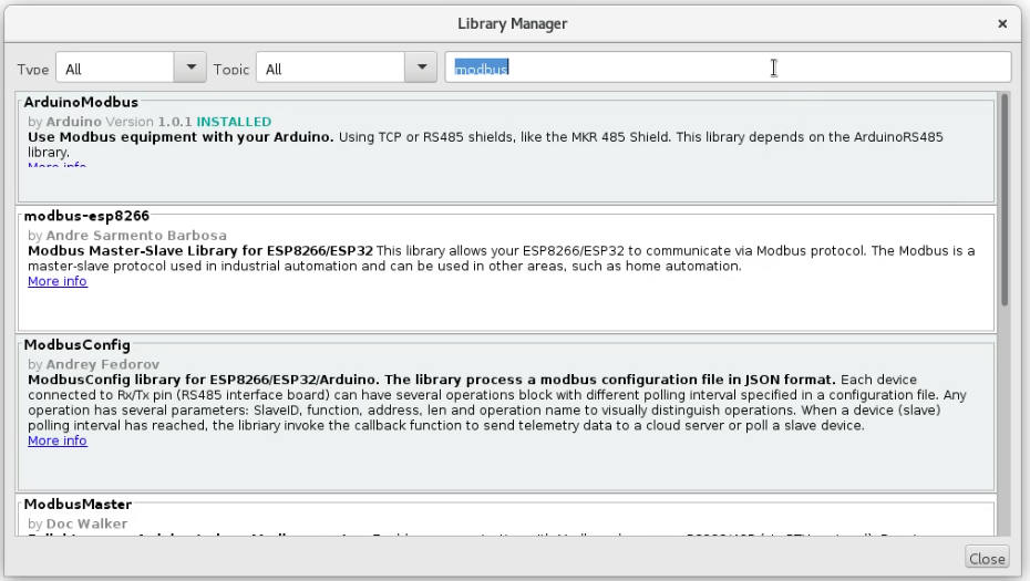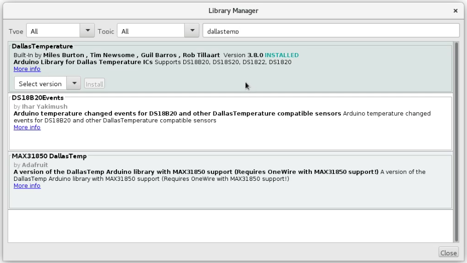 After installing and starting the Arduino IDE for your preferred OS (It can be on the Raspberry Pi but I prefer to connect it directly to my development workstation) install the Arduino Modbus and DallasTemperatrure libraries into the Arduino IDE.