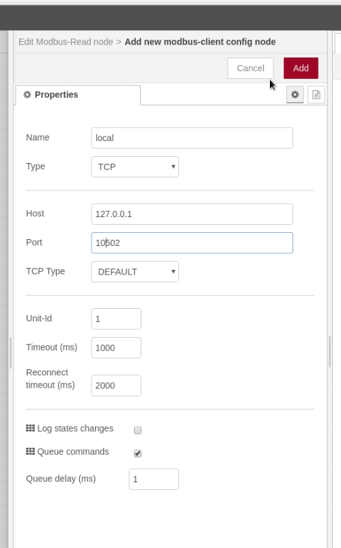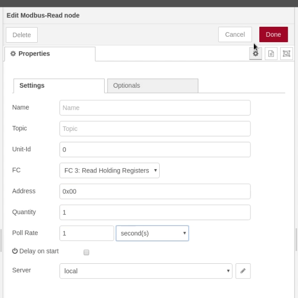 First, the Modbus Read Node needs to be configured to connect to the Modbus server.