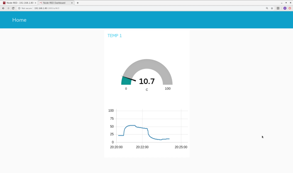 Now with both sets of connected nodes deployed we open the Dashboard page and can see the simple visualizations from the data collected from our PLC: http://your_pi_ip:1880/ui/