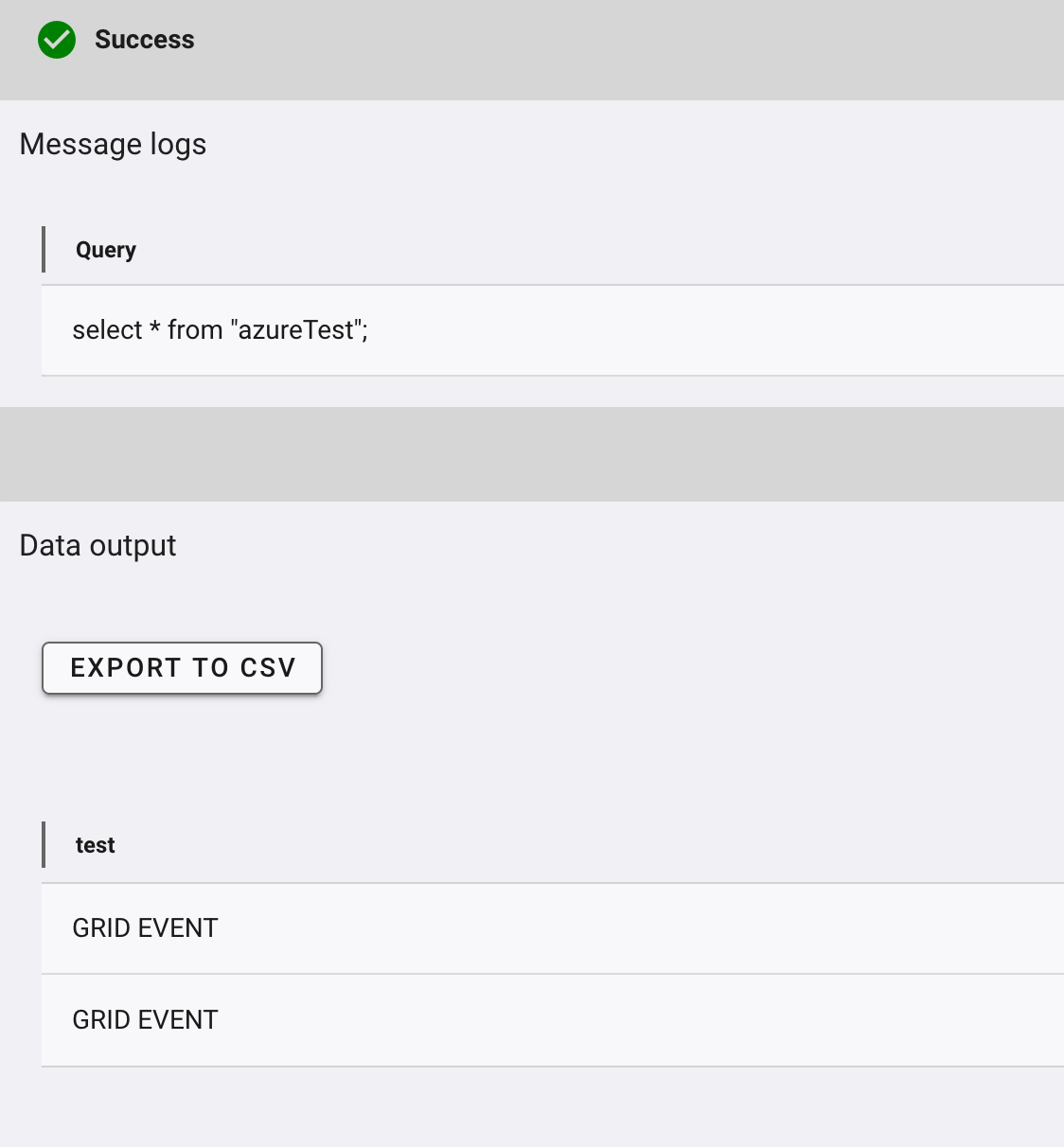 Once your message is sent, you should have a new container in your GridDB Cloud instance called ‘azureTest’ and it should have one row of data inside of it with a value of ‘GRID EVENT TRIGGERED’ — cool!