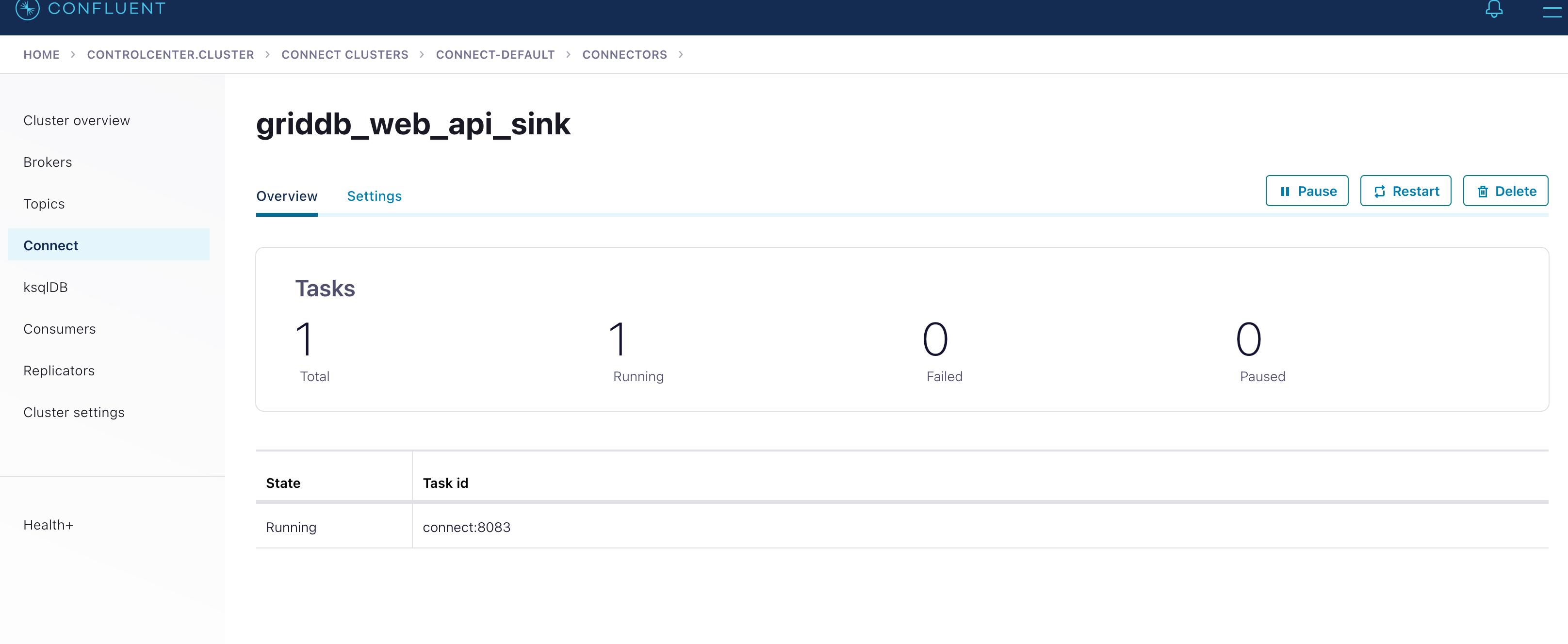 To send the connectors to your Kafka cluster, you can either manually enter in the values using the Kafka Control Center, which provides a nice UI for editing connectors, or simply take the .json files included with this repo and pushing them using CURL.