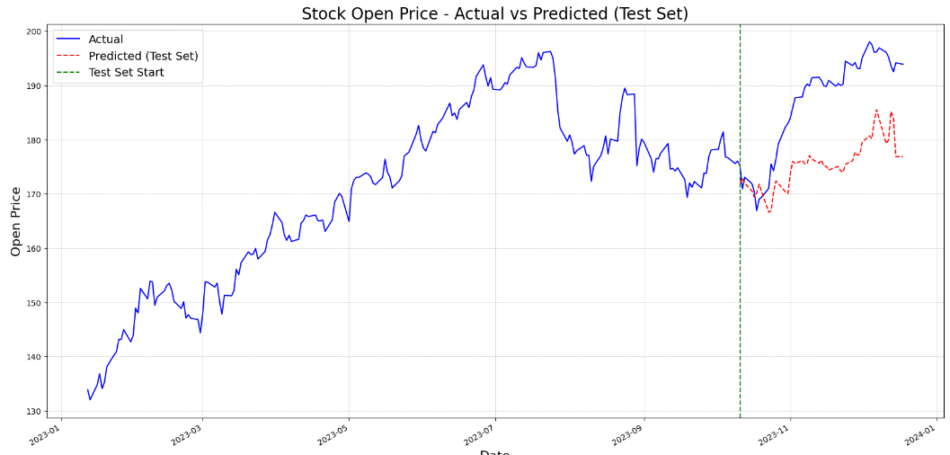 Finally, the script below plots the actual stock prices for the training set, and the actual and predicted stock prices for the test set.