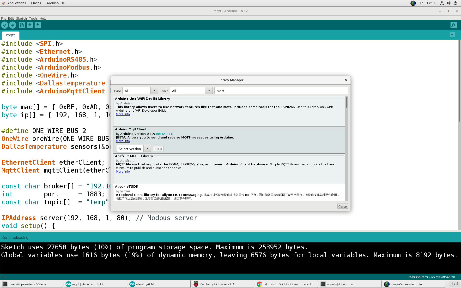 After installing and starting the Arduino IDE for your preferred OS (It can be on the Raspberry Pi but I prefer to connect it directly to my development workstation) install the Arduino Modbus and DallasTemperature libraries into the Arduino IDE.
