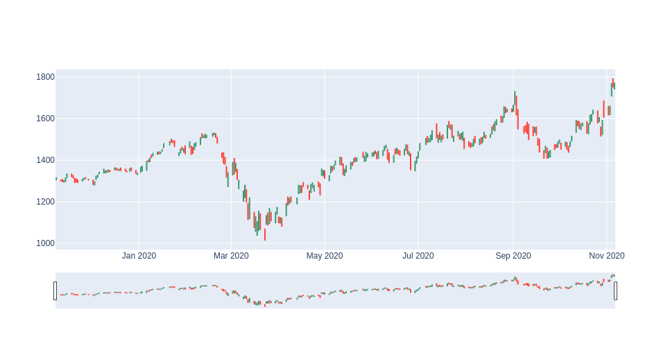 We see that there was a dip in google stock in March. Moreover, the red lines are more prominent in the earlier half of the year than the latter. This could be due to multiple factors like the COVID epidemic, for instance. In a later post, we will try to analyze stock trends with Covid spread data.
