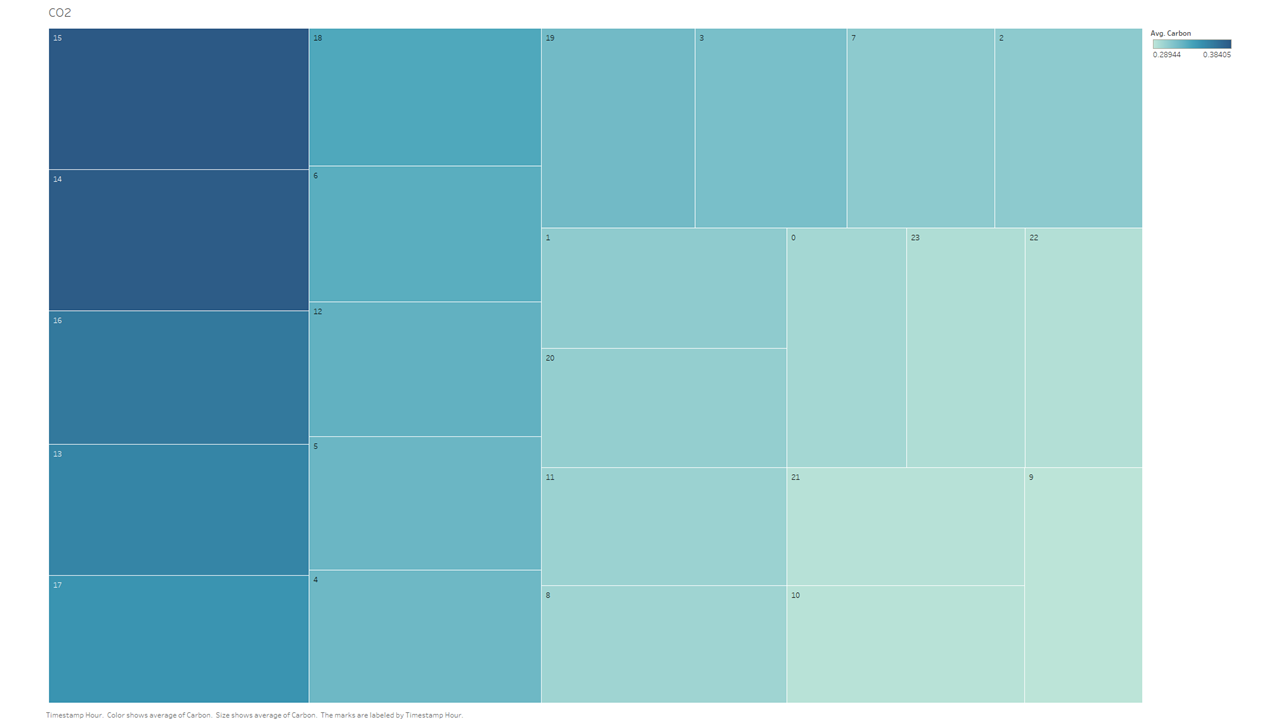 What this dataset is showing us that, if you take ALL data points from the entire year of 2019, on average, hour 14 and hour 15 (2pm and 3pm) have the highest/worst emissions of carbon. This totally matches our preconceived notions of what what we consider normal “traffic hours”, but it does skew a tad earlier than I had expected. Though that could be explained by remembering that the dataset includes weekends and those data could skew the normal “traffic bump” a bit.
