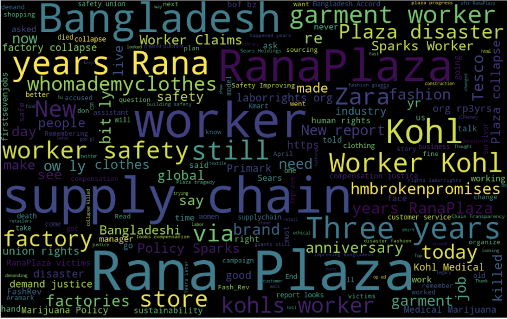 The equivalent WordCloud for the entire dataset contains important keywords like Worker Safety, Supply Chain Disaster, Bangladeshi Worker, etc.