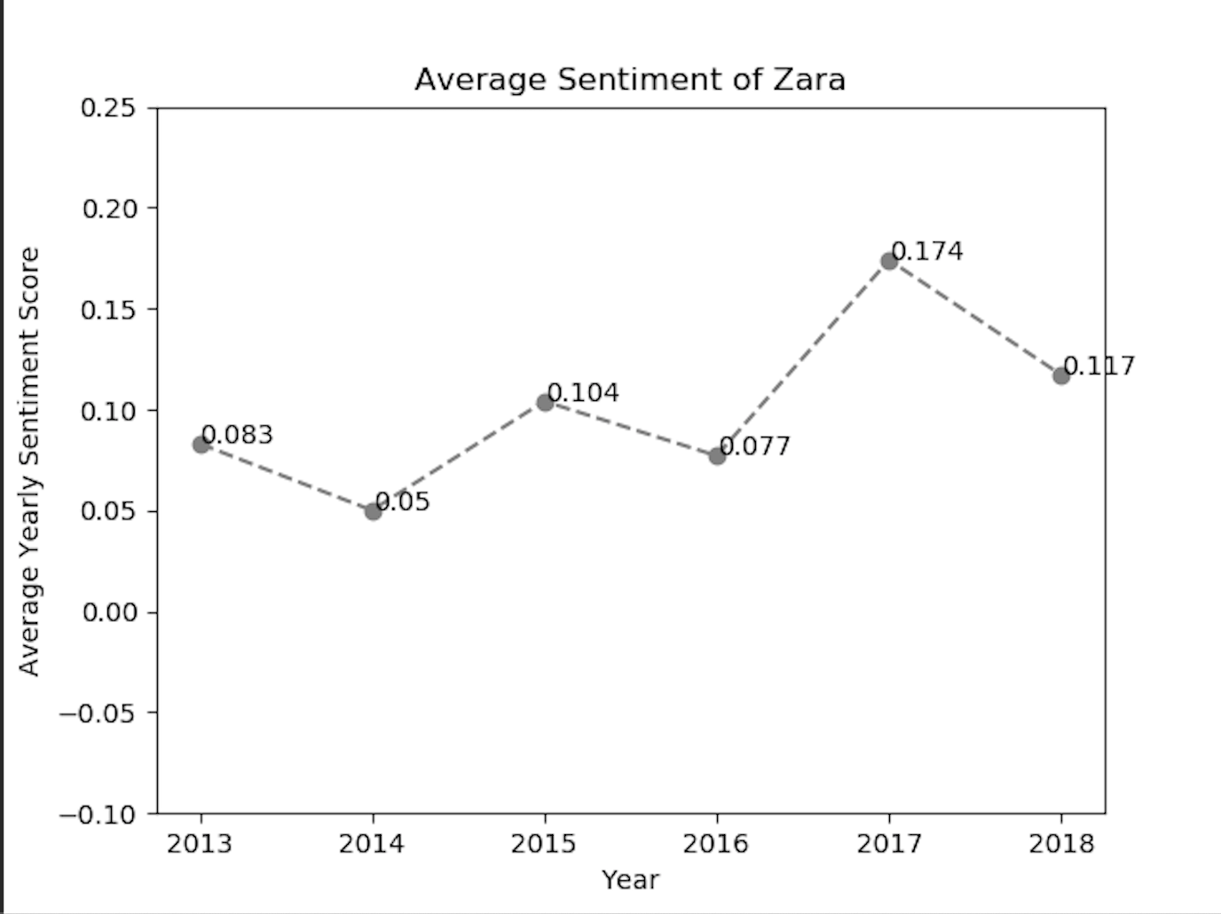We have also implemented the matplotlib library to visualize the sentiment values exclusively for each of the fashion brands. Using the above code snippet for matplotlib line-chart, we got the sentiment positive trend for brands like Zara and Gap.