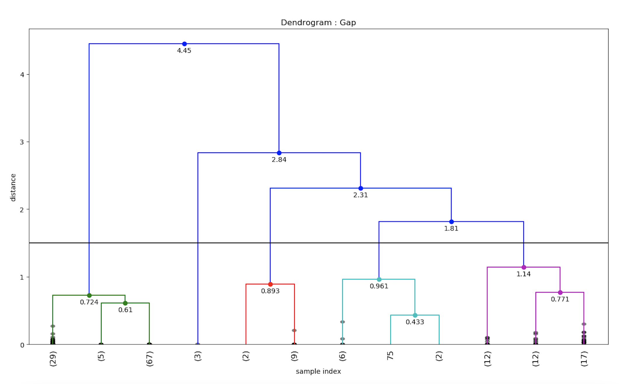 Now we have the 4 clusters with their mean distance, we can feed it into the dendrograms function to plot the same.