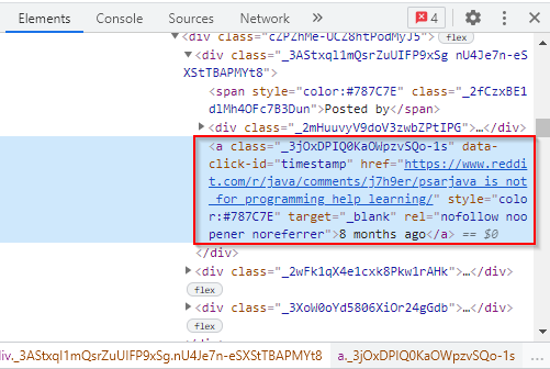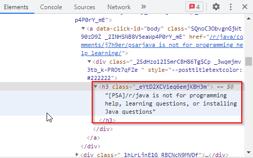 We will use the above HTML tags to scrape the title posts and the times they were created from the website. The following is the Java code for scraping the titles: