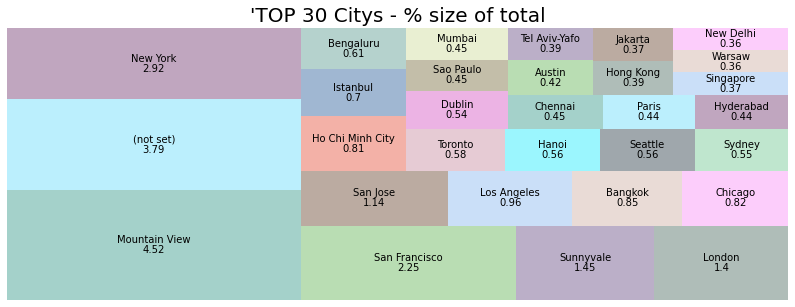 g.set_title("'TOP 30 Citys - % size of total",fontsize=20)