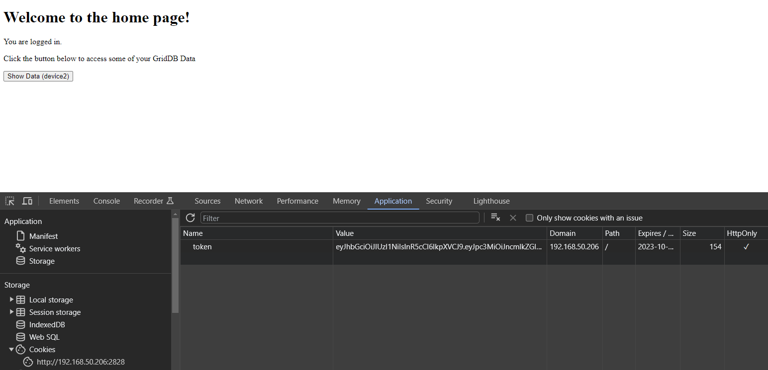 トークンを使用するもう 1 つの一般的な(そして時には推奨される)アプローチは、クッキーへの保存を省略し、代わりに作成する すべてのエンドポイントがリクエストのヘッダでトークンを必要とするようにすることです。前回のブログではこの方法を取りました: https://griddb.net/ja/blog/build-your-own-go-web-app-with-microservices-and-griddb/。