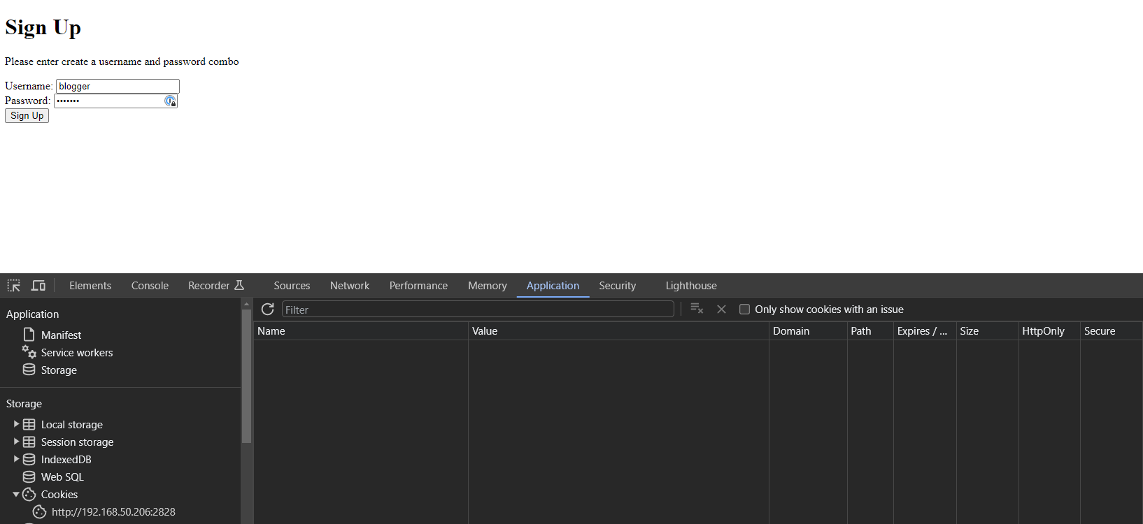 JWTを実装し、適切な使い方を紹介するために、ある種の認証システムを設定したいと思います。そこでは、ユーザは、選択したユーザ名とパスワードを使ってサインアップし、ユーザ名とパスワードをハッシュ化されたパスワードとともに永続ストレージに保存し、ユーザ名とパスワードを使ってサインインし、認証情報が検証されたときにJSON Web Tokensを割り当て、JWTをユーザのブラウザにクッキーとして保存し、このクッキーを使って保護されたエンドポイント/ウェブページにアクセスします。