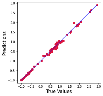 plt.xlabel('True Values', fontsize=15)
