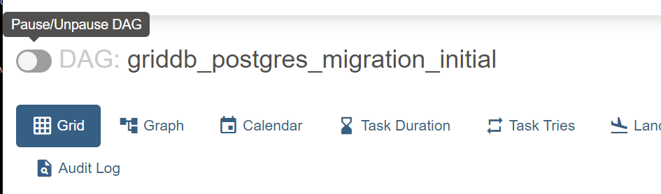 まず、griddb_postgres_migration_initialというIDのDAGをオンにしてみましょう。クリックすると、名前の横に小さなスイッチがあり、そこでオン・オフを切り替えることができます。
