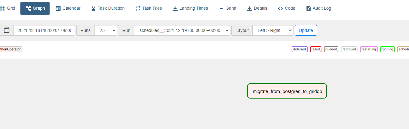 Let’s head back over to the UI and activate these DAGs. Our DAG which simply does an initial bulk migration is scheduled to run only once. Let’s turn that one on and make sure it runs. Use the search bar search DAGs and search GridDB.