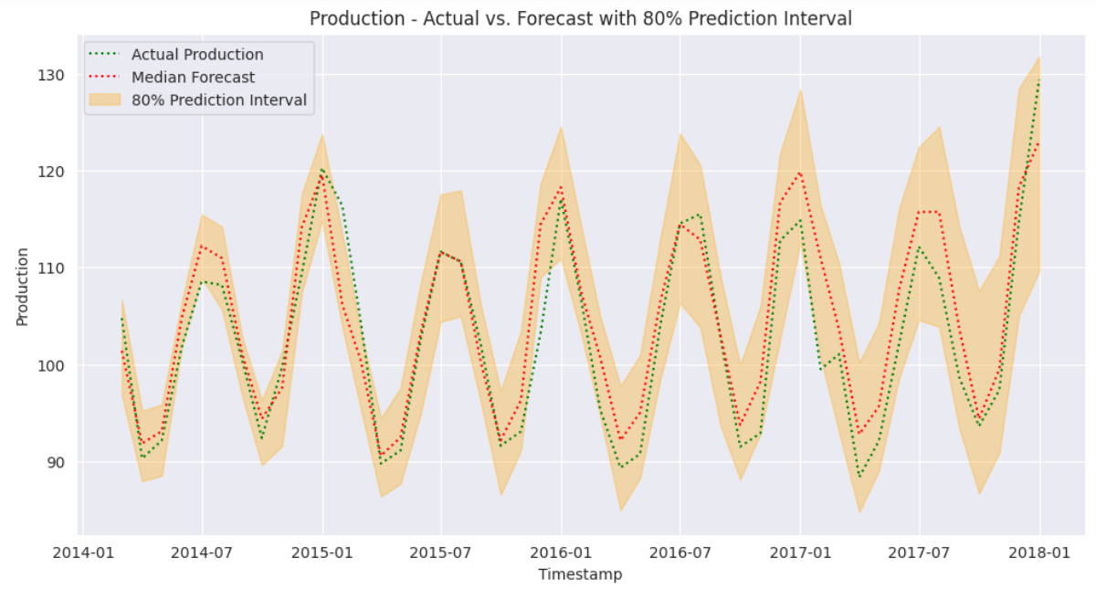上記の出力結果から、予測値の80%区間がテストデータのほぼすべてをカバーしていることがわかります。これにより、当社のモデルが時系列データの予測において極めて高い性能を発揮していることが示されています。