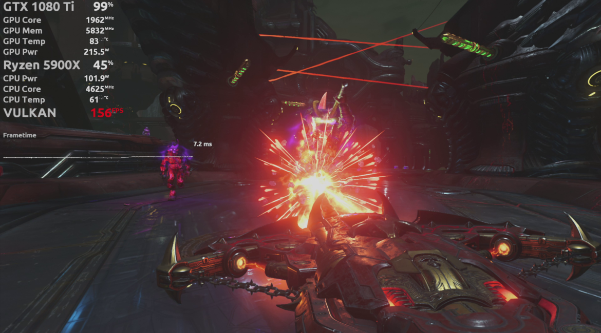 | AMD Ryzen 9 5900X | NVIDIA GeForce GTX 1080 Ti | 16GB (2x8GB) 3200MT/s | Doom Eternal | Microsoft Windows 11 Pro Build 22000 | Gigabyte Technology Co. Ltd. B550I AORUS PRO AX |